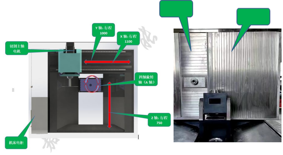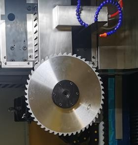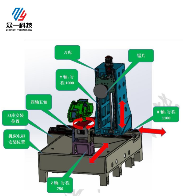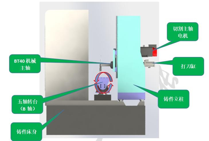 切割主軸;采用電機帶動BT40機械主軸連續旋轉,轉速3000rpm/min,配有自動打刀缸,主軸上方裝有打刀按鈕,更換不同型號鋸片時直接手動切換即可,無需在設備上更換,安全、省力。